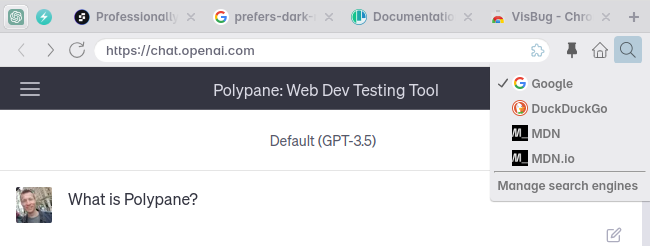 You probably don't always want to search in your default search engine, sometimes you want to look up something in a specific one, like MDN. You can do that by prefixing your search with the first few letters of a search engine name, like m query for MDN or ec query for Ecosia.