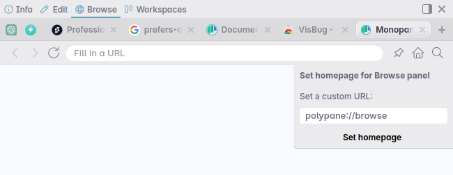 You can open the homepage in any current tab by clicking the home icon in the address bar. The default homepage has quicklinks to Polypane documentation, and it's what's shown when you open new tabs.