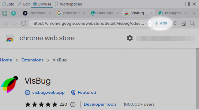 When you open a Chrome web store link in the browse panel, Polypane will automatically show an "add" or "remove" button in the address bar, from which you can quickly add or remove the extension.